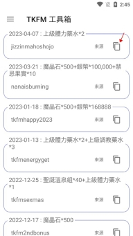 除了上述功能,tkfm工具箱还具备虚宝码功能,助力玩家获取众多游戏资源兑换码,如此一来,玩家就能领取到更多福利礼包。而且该功能支持一键复制粘贴,让兑换过程更为便捷。有此需求的小伙伴们,赶快下载体验吧!