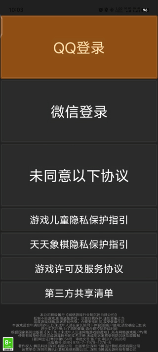 1、打开天天象棋无障碍版,选择登录方式,支持QQ登录和微信登录;