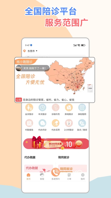 桔小跑陪诊APP是由桔桔网络科技(东莞)有限公司出品的陪诊服务APP。提供全国范围24小时的陪诊服务,为客户提供线上下单、线下陪诊/陪护。根据客户需求,匹配专业陪诊师陪同就医、代问诊、夜间就诊、急诊陪诊、提前约号、异地就诊、代办买药、入出院办理、送取结果、代办跑腿等相关服务,正规专业的陪诊服务平台