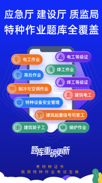 特种作业考试宝典是一个针对特种作业及特种设备作业考试的全新题库,包含电工作业、焊接与热切割作业、高处作业、特种设备安全管理、锅炉作业、起重机作业、特种设备焊接作业、叉车、观光车等相关考试学习内容。特种作业考试宝典提供顺序练习,模拟考试,错题回顾等多种学习模式。 特种作业考试学习,就用特种作业考试宝典。