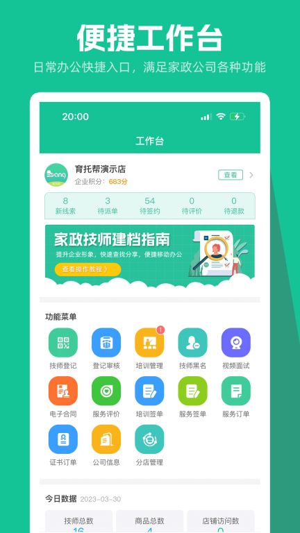 育托帮专注于便捷的、在线的、易用的家政管理系统,为家政公司提供可靠的管理保障,如电子合同,视频面试,阿姨档案,阿姨名片,阿姨简历,客户跟进等等功能和家政相关的企业服务,随时欢迎您前来体验【服务咨询电话:13880212777】