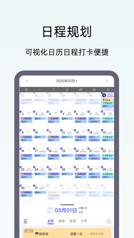 日程打卡助手提供了制定日程、管理日程、日程打卡、打卡统计等功能。