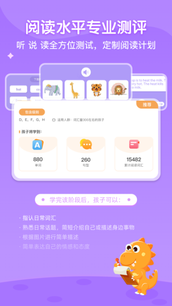 通过定级测试,精准定位孩子当前水平并推送对应难度绘本(含8大测试题型、9组45道题库)。另有30次阶段测试,让孩子随时学随时测,实时掌握孩子学习进展。