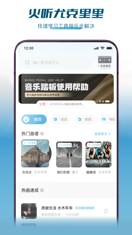 “火听尤克里里“app是一款针对尤克里里谱、尤克里里教学而开发的一款音乐软件,可以与火听智能蓝牙无线翻谱器配套使用。