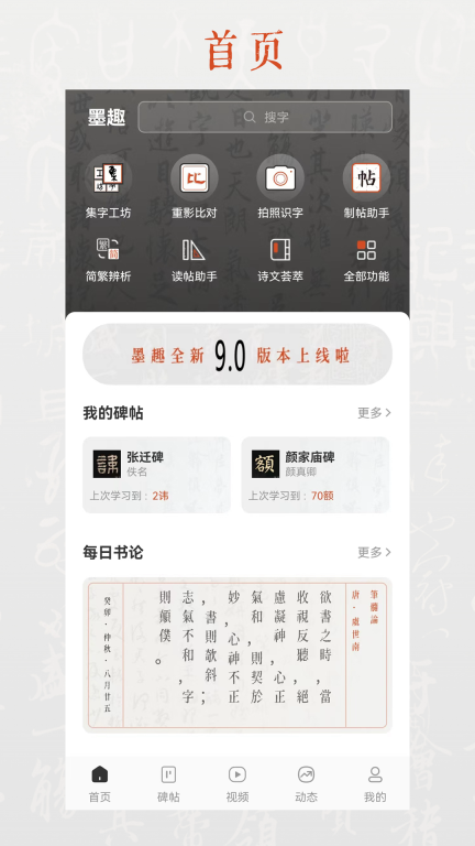 墨趣书法APP是一款服务书法爱好者的学习平台,由北京墨趣科技有限公司于2015年研发上线,秉持“墨趣,助书法学习更高效”的理念,内有核心功能: