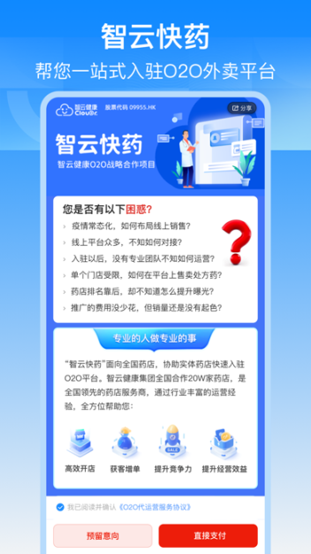 ②智云快药服务 :帮助药店一站式入驻美团/饿了么等O2O平台,百人专业代运营团队,提供优质专业的代运营服务。帮助提升药品的线上渠道销量;