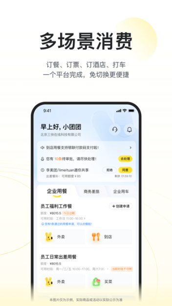 基于美团平台海量商家资源,集中外卖、堂食、酒店、机票、打车等优势供给,全面覆盖用餐、差旅、用车、福利发放等企业消费场景。