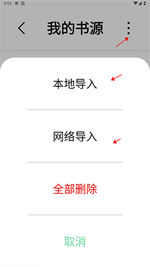 2、接着,系统会自带一些书源。要是您觉得这些书源不够用,可点击右上角,这里支持本地导入与网络导入。