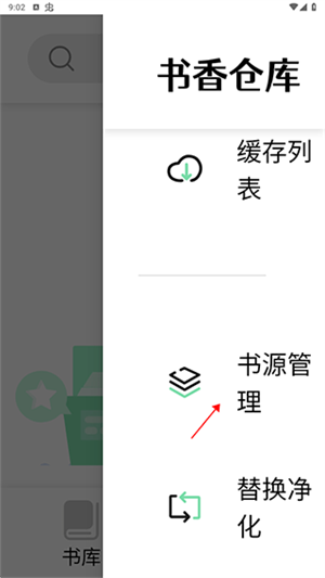 1、在手机中,点击「书香仓库」,然后点击右上角的三个点,选择书源管理