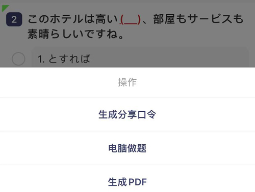 操作其实很简单。打开烧饼日语VIP后,在里面挑选一个你想学习的内容,点击进入。这时,你会看到页面右上角有个类似电脑的图案,点击它,就能看到【生成分享口令】【电脑做题】【生成PDF】这些选项,你只需点击【生成PDF】即可。