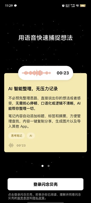 闪念贝壳是一款便捷实用的语音笔记软件。它具备智能语音笔记记录功能,能迅速把你的声音转化成文字笔记。借助AI大数据技术,转化后的内容清晰且有条理,还会依据记录时间、人员等信息自动分类。软件支持添加图片信息,涵盖中英文、德语、日语、法语等多种语言,就连上海话、粤语等热门方言也能识别,使用体验十分便捷!
