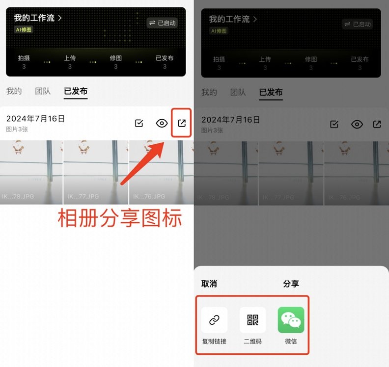 完成照片拍摄后,进入已发布界面,点击发布图标,此时会出现复制链接、二维码、微信这3种分享途径。