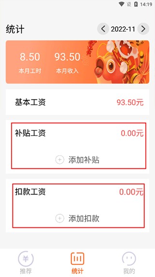 4、统计界面还可以添加补贴工资和扣款工资的信息