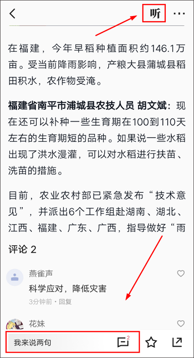2、来到新闻页面后,点击右上角的【听】图标,就能收听该新闻。对于那些希望深入了解新闻的朋友而言,这种方式更为适宜。因为通过此方式,他们不仅能够一边阅读新闻一边聆听,还能在评论区与其他用户展开探讨。
