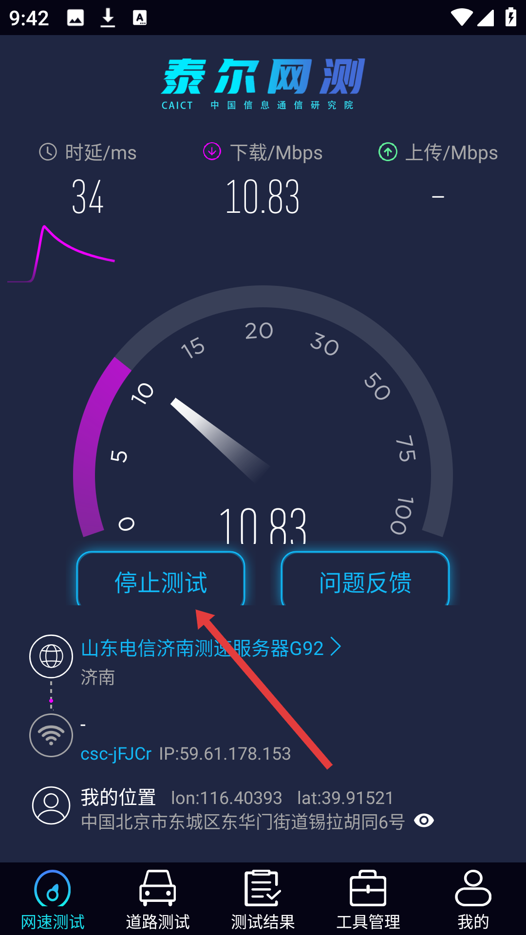 2、在测速过程中点击【停止测试】,结束当前测速任务。