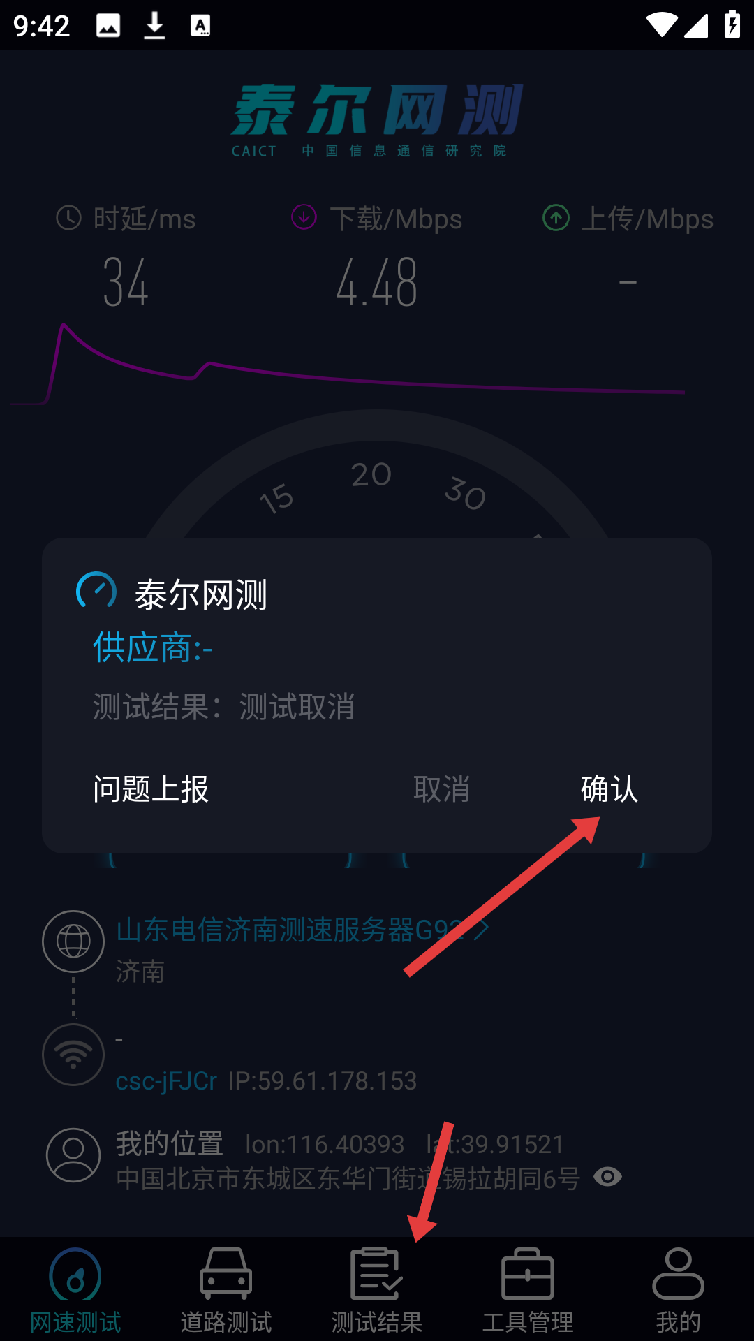 3、在提示弹窗点击【确认】后,点击测试结果进入页面。