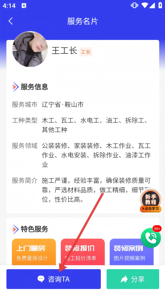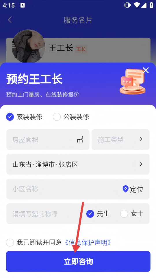 3、在服务名片页面,查看工长的服务信息,确认匹配需求后,点击底部【咨询TA】按钮,进入预约咨询信息填写页面。