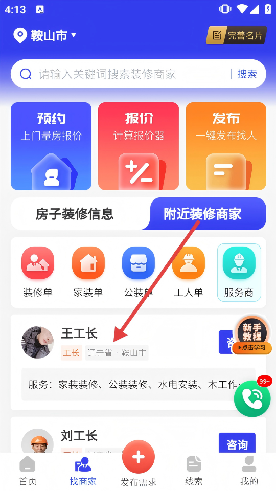 2、在附近装修商家列表中,选择目标工长,点击进入其服务名片页面。
