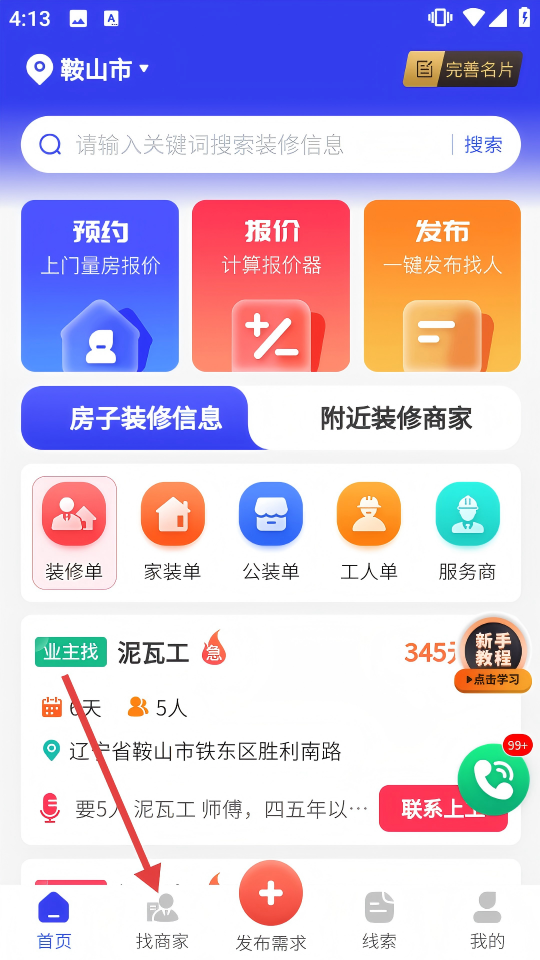 1. 开启APP,轻点底部导航栏中的【找商家】按键,转换至附近装修商家的标签页面。
