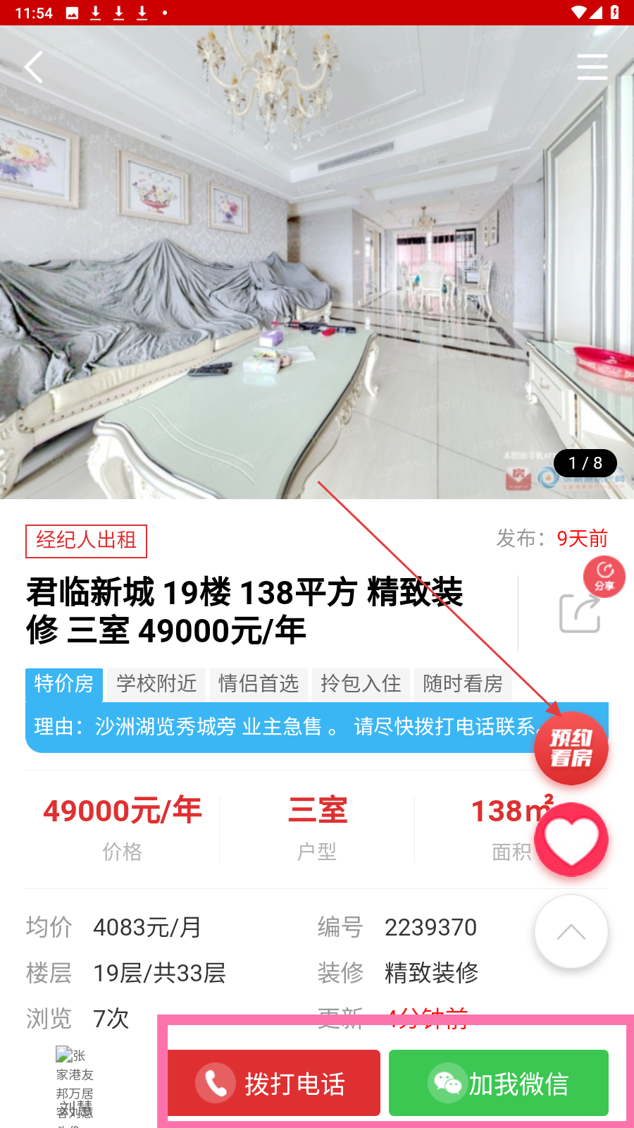 4、在房源详情页,点击【预约看房】【拨打电话】或【加我微信】,联系经纪人咨询。