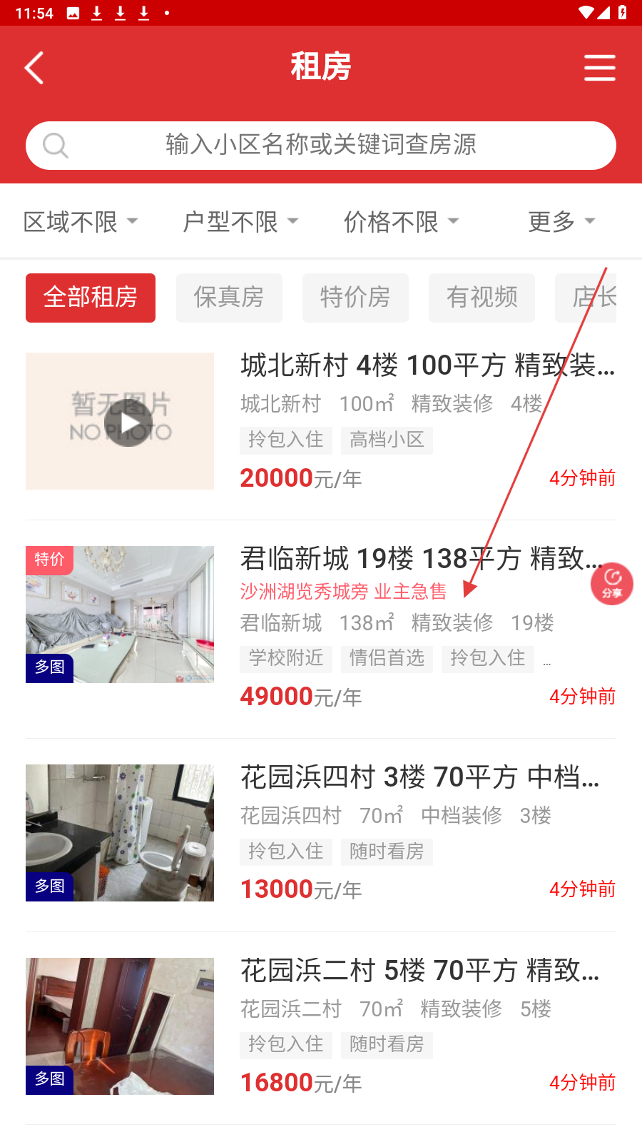 2、在租房页面,点击【全部】选项,查看所有租房房源信息。
