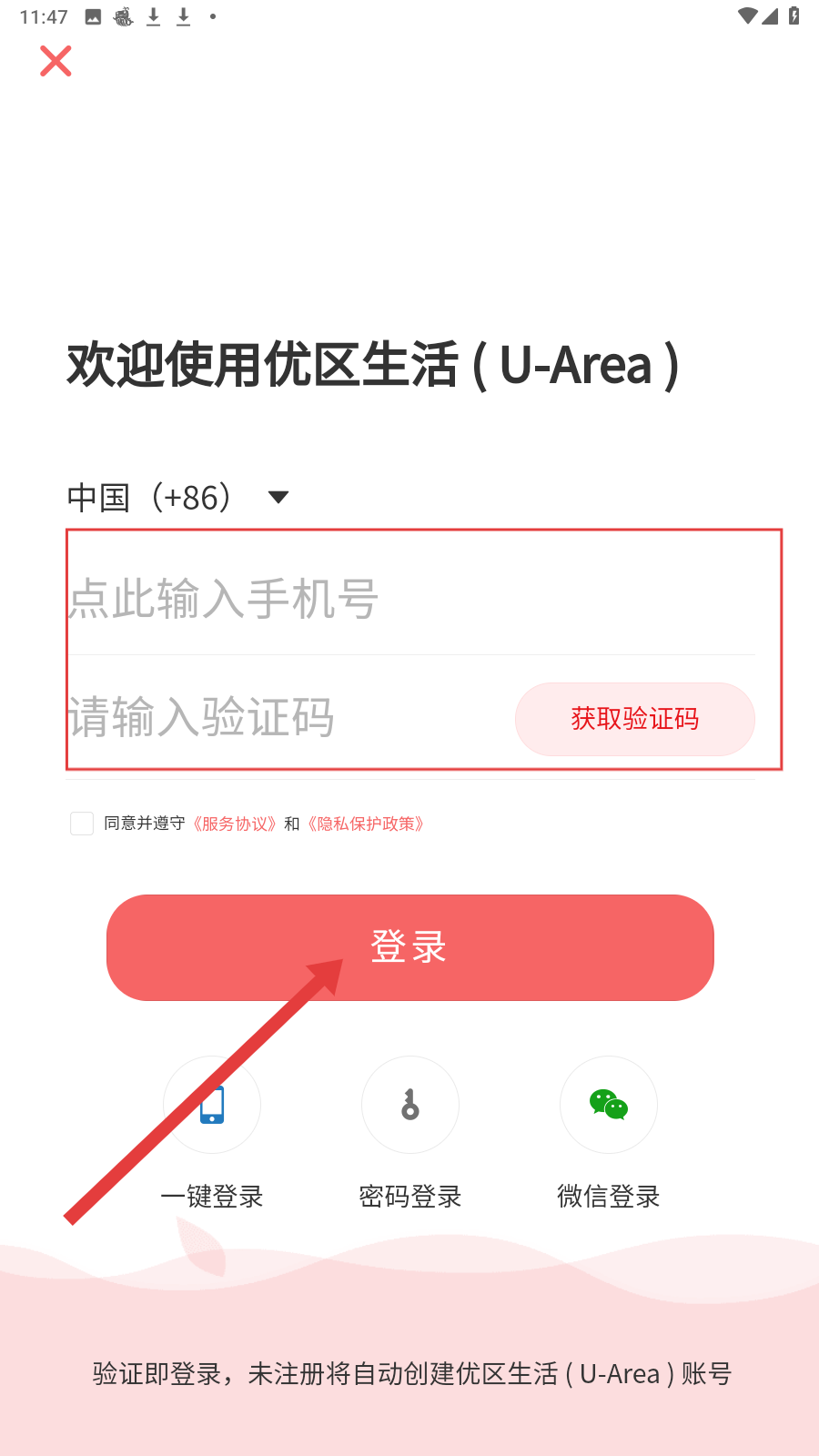 3、在登录界面,输入手机号,获取验证码并输入,点击【登录】按钮。