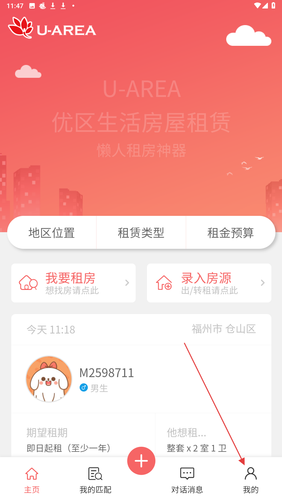 1. 开启优区生活租房应用程序,轻点底部的【我的】,从而进入个人中心。