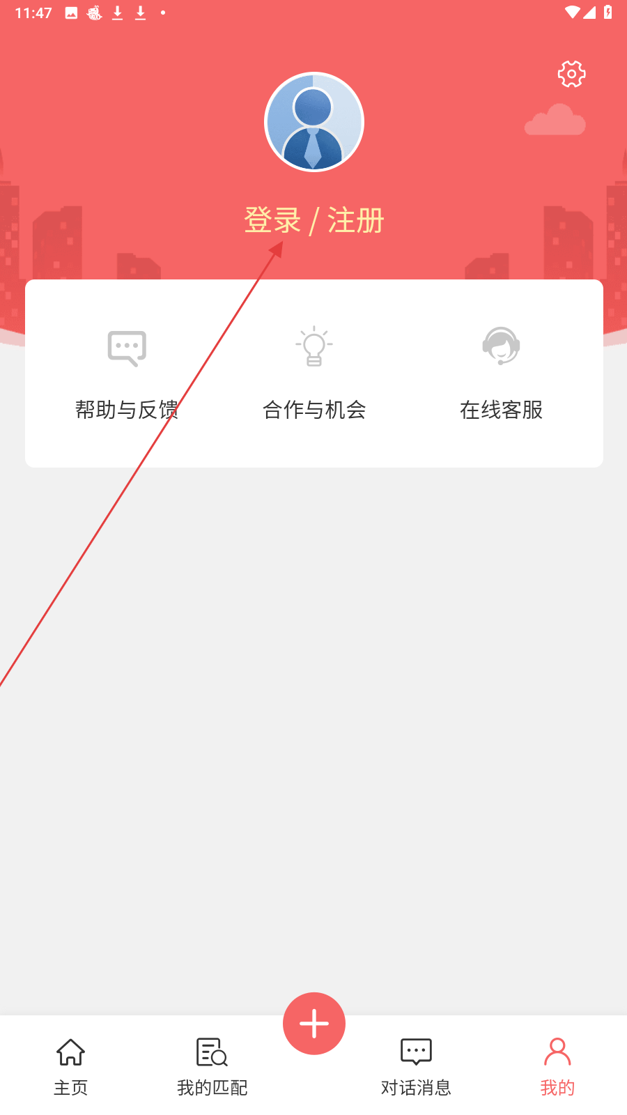 2、在个人中心页面,点击【登录/注册】按钮,进入登录注册界面。