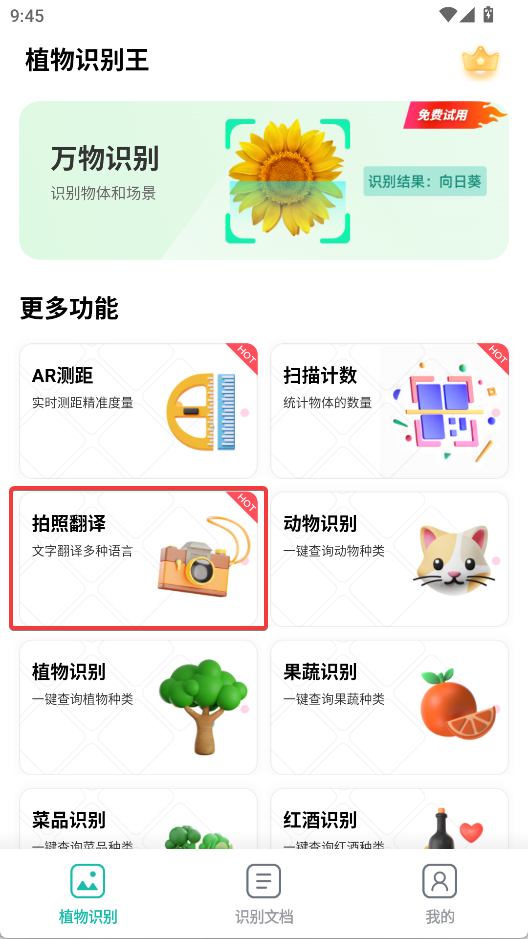 1. 开启植物识别王app,轻点拍照翻译。