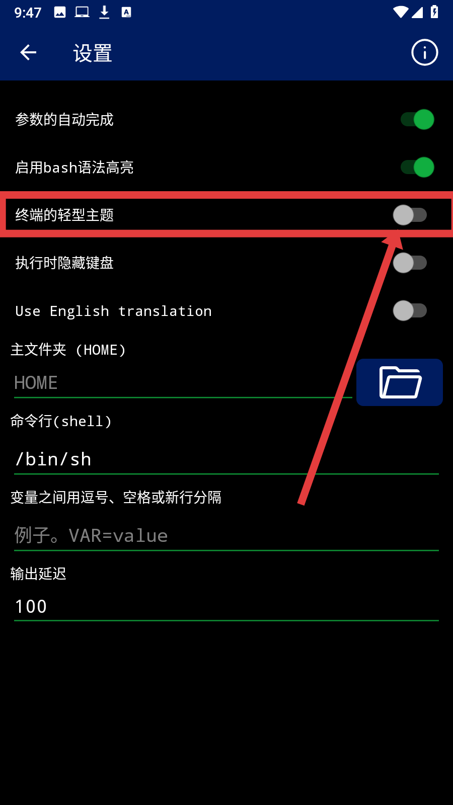 3、在设置页面开启【终端的轻型主题】,进行主题切换。