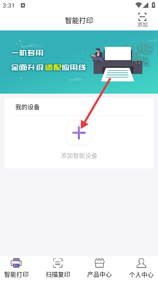 2、在智能打印页面的【我的设备】板块,点击【添加智能设备】按钮,进入扫码添加页面。