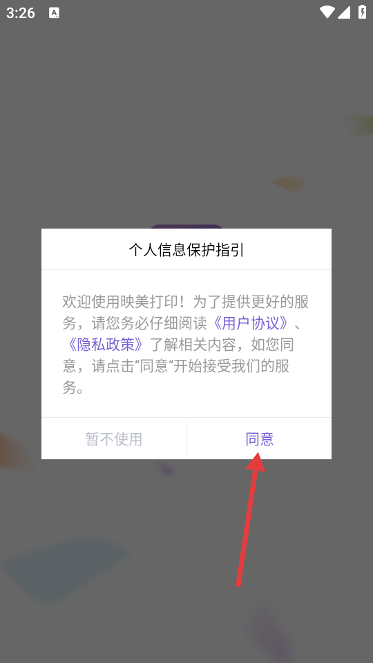 1. 开启映美打印APP,当【个人信息保护指引】窗口弹出时,点击其中的【同意】按钮,随即进入智能打印主界面。