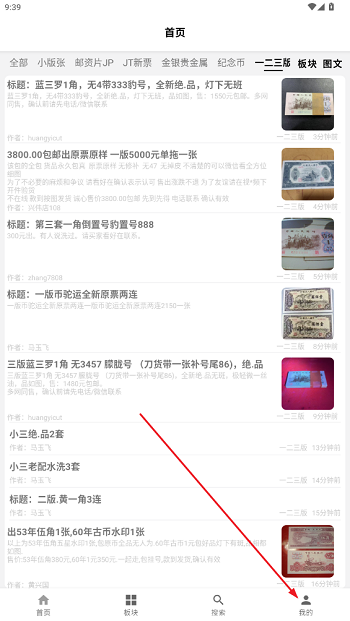 首先下载邮币卡一尘app,完成安装后打开该应用。进入首页界面,找到并点击“我的”选项。