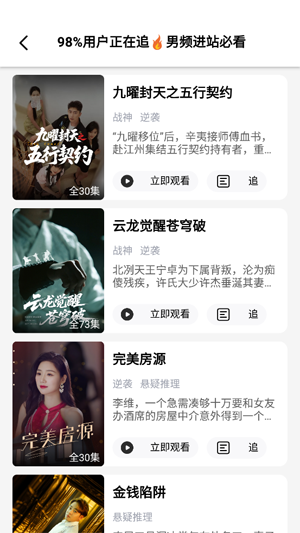 剧情紧凑:平台上的短剧普遍节奏快、反转多,每一集时长短,非常适合在零散时间观看,让用户能够快速进入剧情,享受追剧乐趣。
