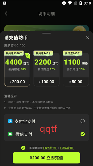 在重置界面选择你需要充值的坊币数量,点击立即充值。