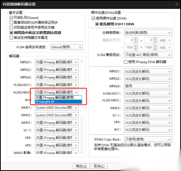 在H.265/HEVC下拉选项中,选择FFmpeg64.dll,然后确定-确定即可。