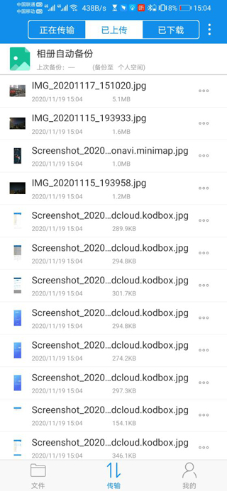 通过【传输】,用户可以便捷地对文件上传下载、相册备份的进度进行查看和管理。