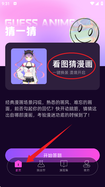 3、进入到软件首页,如图所示。这里是看图猜漫画的答题玩法。