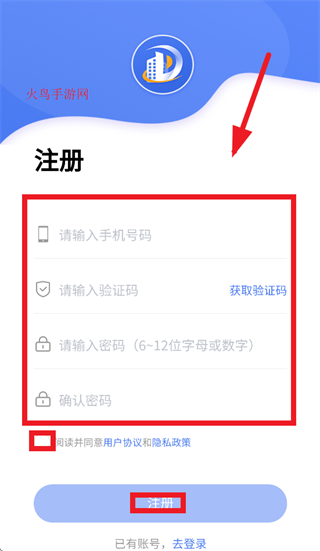 只需输入手机号、验证码与密码,勾选“阅读并同意用户协议和隐私政策”,再点击“注册”,就能轻松完成注册流程。