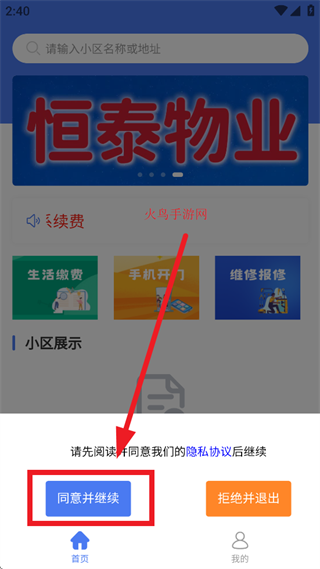 下载安装并打开迪迪物业app,进入后在请先阅读并同意我们的隐私协议后继续提示界面点击同意并继续