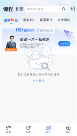 3、点击下方工具栏中的“精进”,其中包含面霸优选、面霸一对一、国家面试以及省考面试等板块。