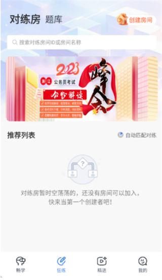 2、点击下方工具栏的“狂练”,既能搜索对练房间ID或房间名称相关信息,又会为用户推荐各类信息。
