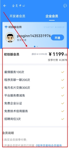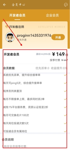 2、之后便能分别看到【开发者会员】¥149/月和【企业会员】¥1199/月这两种需求选项,用户只需选择自己所需的即可。