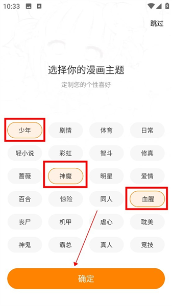 2、接下来便能够着手挑选心仪的主题,像我钟爱的漫画类型有【少年】【神魔】【血腥】,选定之后点击确认就行。