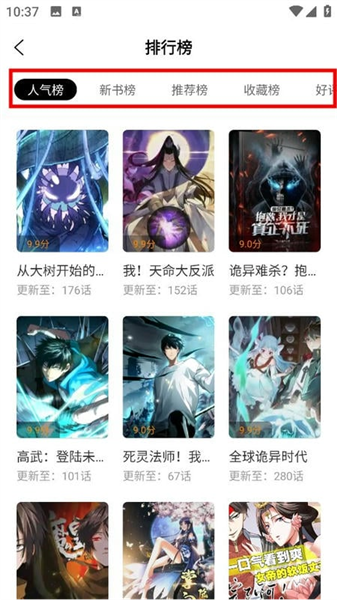 4、于【排行榜】中,能够看到人气榜、新书榜、推荐榜、收藏榜、好评榜等各类榜单,用户可依据自身需求进行选择。