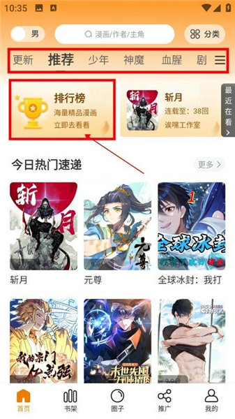 3、进入首页,在上方菜单栏左右滑动,就能选择心仪类型;点击【排行榜】,还可查看当下热门漫画等内容。