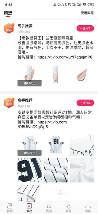 2、登录后,界面分为首页、素材、找货、收收益和我的五个板块。在首页,用户可以浏览和分享海量商品。