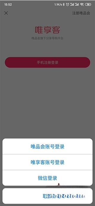 1、在本平台并安装唯享客,打开后可通过微信、唯享客账号或唯品会账号登录。