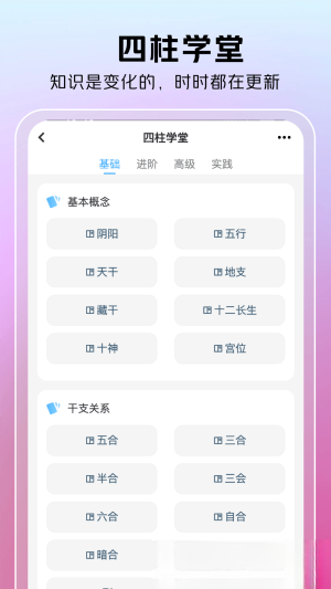 3. 内建的四柱学堂还能学到古人对日历与时间的基本概念,比如阴阳五行、天干地支等。