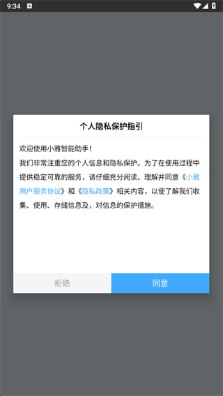 1、小雅智能助手软件,看到如下弹窗直接点击同意。